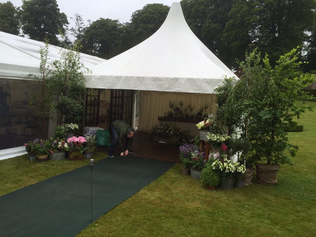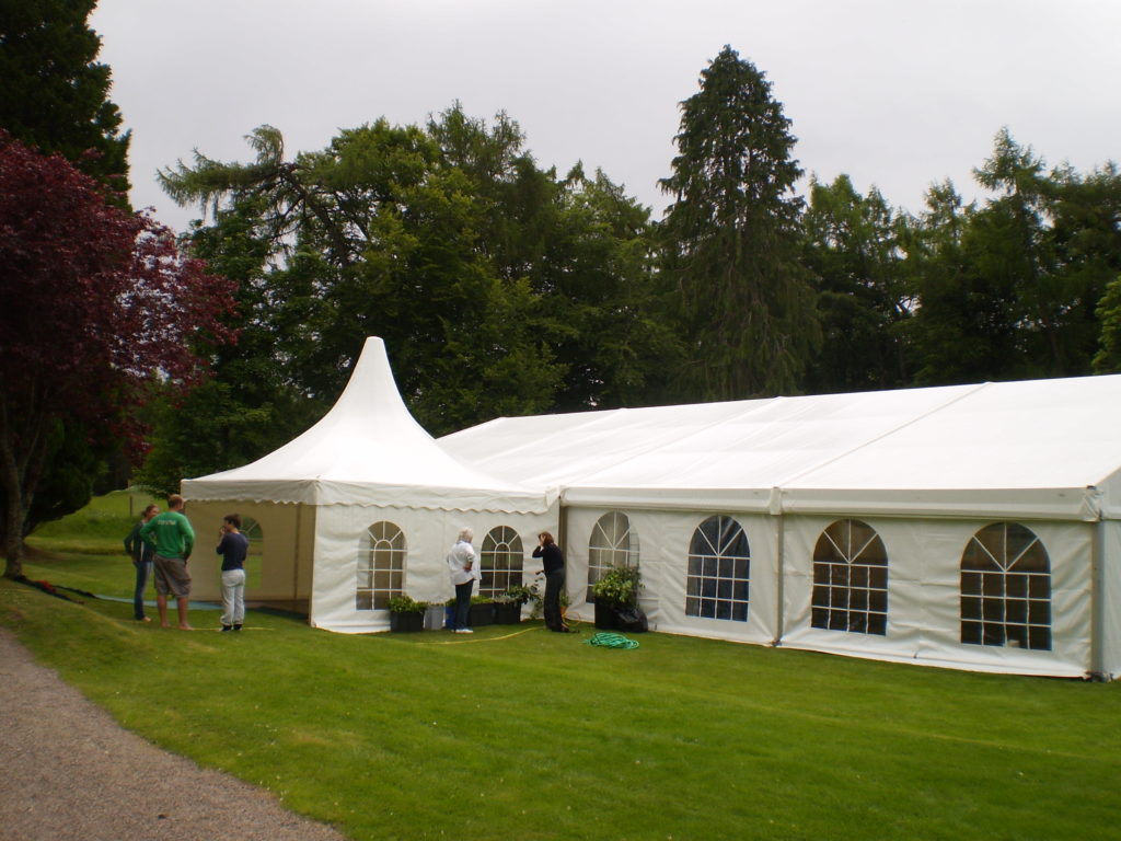 Often we bolt the pagodas onto to larger structures creating an excellent porch area, with flooring and ivory pleated lining they look like extensions of the main marquee, with a difference.